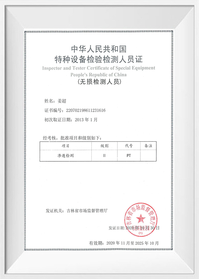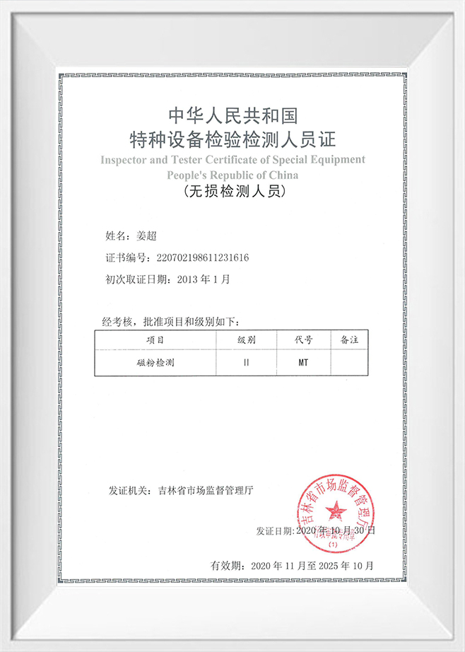 Inspektor- und Testerzertifikat der Spezialausrüstung Volksrepublik China